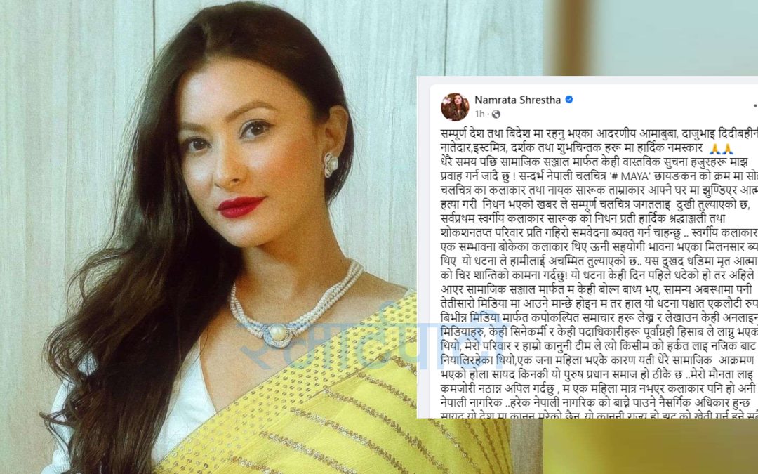 काठमाडौं । अभिनेत्री नम्रता श्रेष्ठले अभिनेता शारुक ताम्राकारको मृत्य प्रकरणमा प्रहरी प्रशासनलाई सहयोग गर्न तयार रहेको बताएकी छिन् ।