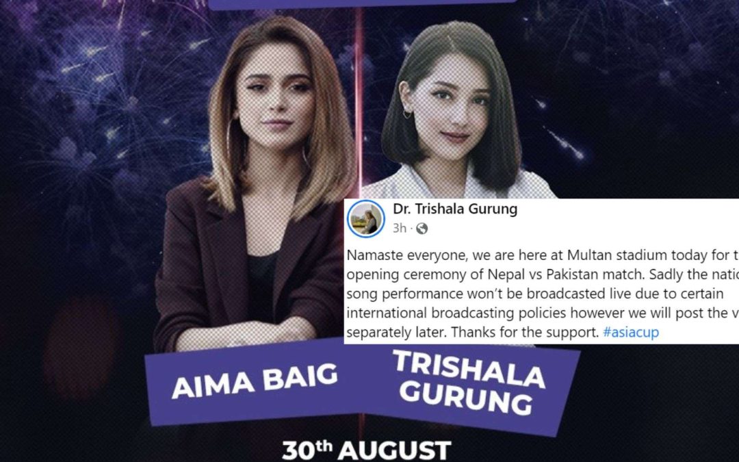 गायिका त्रिशलाले अन्तर्राष्ट्रिय प्रसारण नीतिका कारण नेपाली गीत गाएको प्रत्यक्ष प्रसारण हुन नसक्ने जानकारी आफ्नो सामाजिक सञ्जाल फेसबुक मार्फत गराइसकेकी छन् ।