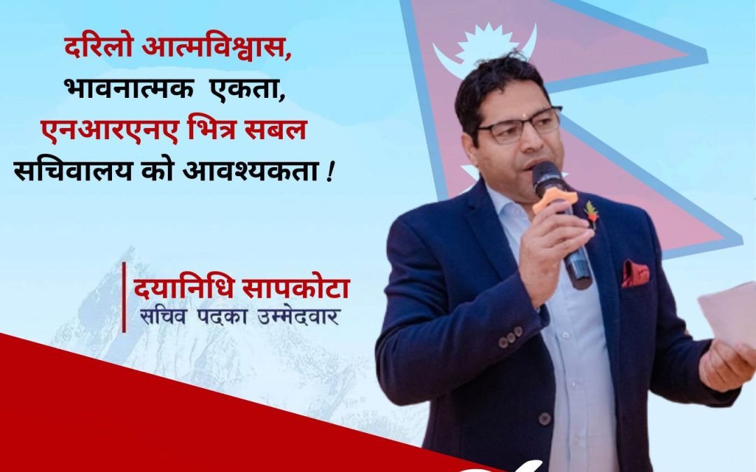 काठमाडौँ । गैरआवासीय नेपाली संघ (एनआरएनए) को ११ औं महाधिवेशनमा केन्द्रिय सचिव पदका उम्मेदवार दयानिधि सापकोटा आफ्ना ५ प्रमुख एजेण्डा अगाडि सारेर चुनावी अभियानमा लागेका छन् । हाल एनआरएनए युरोप उपसंयोजक रहेका सापकोटाले पारदर्शी संगठन, एकताबद्ध एनआरएनए, सबल सचिवालय, जवाफदेही संस्था र गैर आवासीय नेपालीहरुको हकहित, अधिकार र प्रवर्धनका लागि विश्वभर रहेका नेपालीहरुबीच भाइचारा, आत्मियता एवं संगठनात्मक एकताको लागि सचिव पदमा उम्मेदवारी दिने निधो गरेको जनाए ।