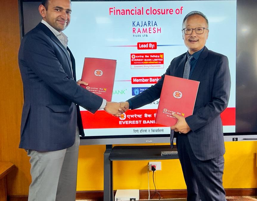 काठमाडौं । एभरेष्ट बैंक लिमिटेडको अगुवाईमा कजरिया रमेश टायल्स लिमिटेडमा लगानी गर्ने सम्बन्धमा सह वित्तियकरण अन्तर्गत सहभागी बैंकहरु बिच वित्तिय सहजिकरण गर्ने कार्य सम्पन्न भएको छ । अगुवा बैंकको तर्फबाट एभरेष्ट बैंकका प्रमुख कार्यकारी अधिकृत सुदेश खालिङ तथा रमेश क्रपका तर्फबाट कम्पनीका उपाध्यक्ष रोहित गुप्ताद्वारा एक विशेष समारोहका बिच सम्झौतापत्रमा हस्ताक्षर सम्पन्न भएको छ । सो कार्यक्रममा सह–वित्तियकरणका अन्य सदस्य बैंकहरु नबिल बैंक, नेपाल SBI बैंक र प्रभु बैंकका उच्च पदस्थ अधिकारीहरु समेतको गरिमामय उपस्थिति रहेको थियो ।