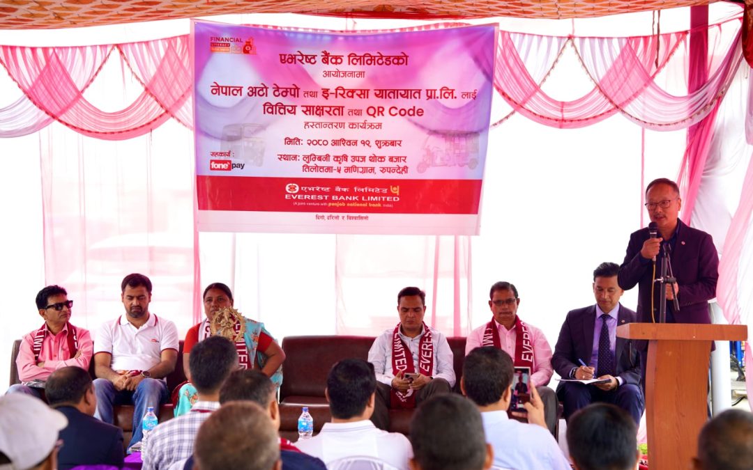 रुपन्देही। एभरेष्ट बैंक लिमिटेडद्घारा नेपाल अटो तथा इ–रिक्सा यातायातप्रा.लि. तिलोत्तमा रुपन्देहीलाई वित्तिय साक्षरता तथा क्यूआर कोड हस्तान्तरण गरेको छ । लम्बिनी कृषि उपज थोक बजार तिलोत्तमा–५ मणिग्राम रुपन्देहीमा आयोजित एक विशेष कार्यक्रमा बैंकका प्रमुख कार्यकारी अधिकृत सुदेश खालिङले नेपाल अटो तथा इ–रिक्सा यातायात प्रा.लि.का ५५ भन्दा बढी सदस्यहरुलाई क्यूआर कोड हस्तान्तरण गर्नुभयो ।