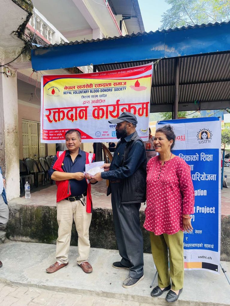 नेपाल स्वयंसेवी रक्तदाता समाजका केन्द्रीय अध्यक्ष एवं हालैमात्र “रक्तदाता सम्राट्” र “राष्ट्रिय रक्त नायक”बाट बिभूषित सर्वाधिक स्वयंसेवी रक्तदाता प्रेमसागर कर्माचार्यले स्वयंसेवी रक्तदाताहरूलाई “प्रशंंसा-पत्र” बितरण गरिएको साे कार्यक्रमकाे सञ्चालन रामचन्द्र रूपाखेतीले गरेका थिए। कार्यक्रमका सभापति एवं नेपाल स्वयंसेवी रक्तदता समाज धादिङ जिल्ला शाखाका अध्यक्ष सुयेश बिक्रम रानाका समेत गरि उक्त कार्यक्रममा महिला तथा पुरूष गरि जम्मा ५३ जनाले रक्तदान गरेको साे कार्यक्रमका आयाेजक नेपाल स्वयंसेवी रक्तदाता समाज धादिङ जिल्ला शाखालाई सम्मान स्वरूप नेपाल रेडक्रस साेसाईटी केन्द्रीय रक्त सञ्चार सेवा केन्द्रले “धन्यवाद-पत्र” प्रदान गरेका थिए ।