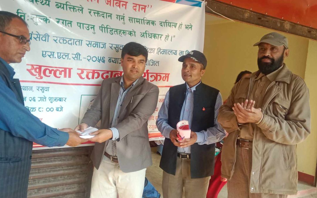 नेपाल स्वयंसेवी रक्तदाता समाज रसुवा शाखा र कालिका हिमालय एसएलसी २०५६ ब्याचको आयोजनामा भएको खुल्ला रक्तदान कार्यक्रममा एकसय ५ जनाले रक्तदान गरेका छन् । नेपाल स्वयंसेवी रक्तदाता समाजका केन्द्रीय अध्यक्ष प्रेमसागर कर्माचार्य, कालिका गाउँपालिका अध्यक्ष हरिकृष्ण देवकोटा, नौकुण्ड गाउँपालिका उपाध्यक्ष चन्द्र तामाङ, नेपाल स्वयंसेवी रक्तदाता रसुवाका सचिव हेमनाथ खतिवडा, उपाध्यक्ष रामशरण गजुरेल लगायत स्थानीय तहका वडा अध्यक्ष तथा जनप्रतिनिधिहरू सहभागी रहेका थिए ।