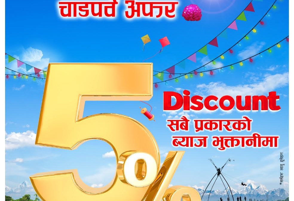 बैंकले एक सुचना जारी गदै नेपालीहरुको वडा दशै तथा शुभ दिपावली,न्यु दया भिन्तुना र छव पर्वको उपलक्ष्यमा ब्याज भुक्तानी रकममा ५ प्रतिशत छुट दिने छ । यसबाट आफना ग्राहक लाई राहत हुनेमा बैंक बिस्वस्त रहेको र बाकीं रकम भुक्तानी हुनेमा आशा बादी रहेको जनाएको छ ।
