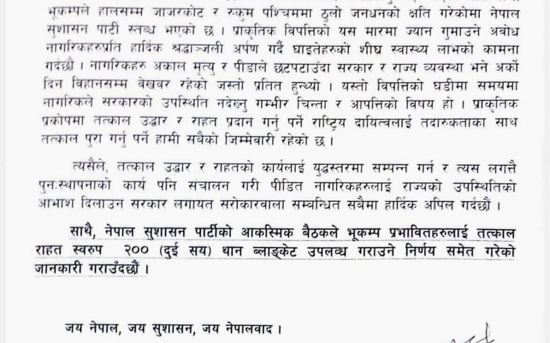 साथै, नेपाल सुशासन पार्टीको आकस्मिक बैठकले भूकम्प प्रभावितहरुलाई तत्काल राहत स्वरुप २०० (दुई सय) थान ब्लाङ्केट उपलव्ध गराउने निर्णय गरेको छ। महासचिव गोबिन्द गिरी द्धारा हस्ताक्षरित विज्ञप्तिमा जनाइएको छ।