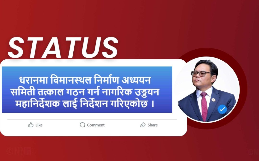 ‘‘धरानमा विमानस्थल निर्माण अध्ययन समिति तत्काल गठन गर्न नागरिक उड्डयन महानिर्देशकलाई निर्देशन गरिएको छु’’, मन्त्री किरातीले लेखेका छन् । हिजो धरानउपमहानगरपालिकाका मेयर हर्क साम्पाङ राईले धरानमाविमानस्थल बनाउन माग गर्दै सरकारको ध्यानाकर्षण गरेका थिए ।