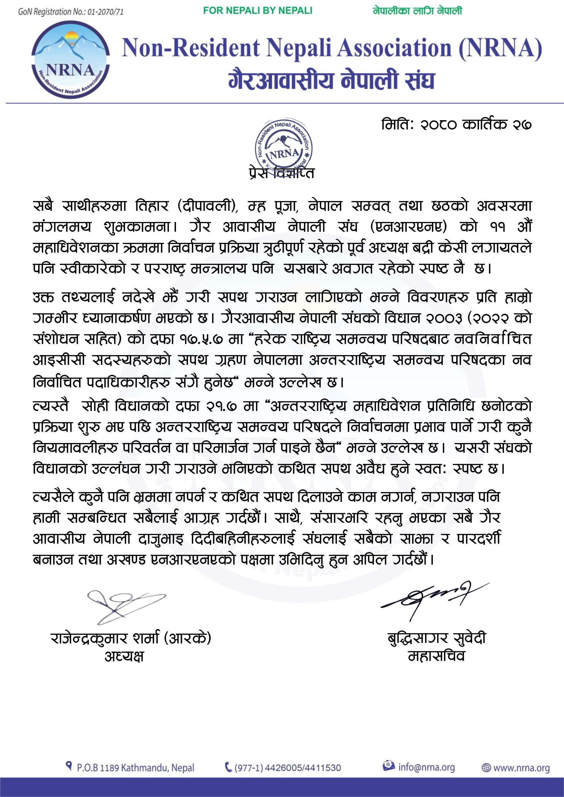 सोमबार एक प्रेस विज्ञप्ति प्रकाशित गर्दै अध्यक्ष शर्मा तथा महासचिव सुवेदीले गैर आवासीय नेपाली संघ (एनआरएनए) को ११औं महाधिवेशनका क्रममा निर्वाचन प्रक्रिया त्रुटीपूर्ण रहेको पूर्व अध्यक्ष बद्री केसी लगायतले स्वीकारेको र परराष्ट्र मन्त्रालय पनि यसबारे अवगत रहेको बताएका छन्। उक्त तथ्यलाई नदेखेझैं गरी सपथ गराउन लागिएको भन्ने विवरणहरु प्रति आफ्नो ध्यानाकर्षण भएको उनीहरुले जनाएका छन्।