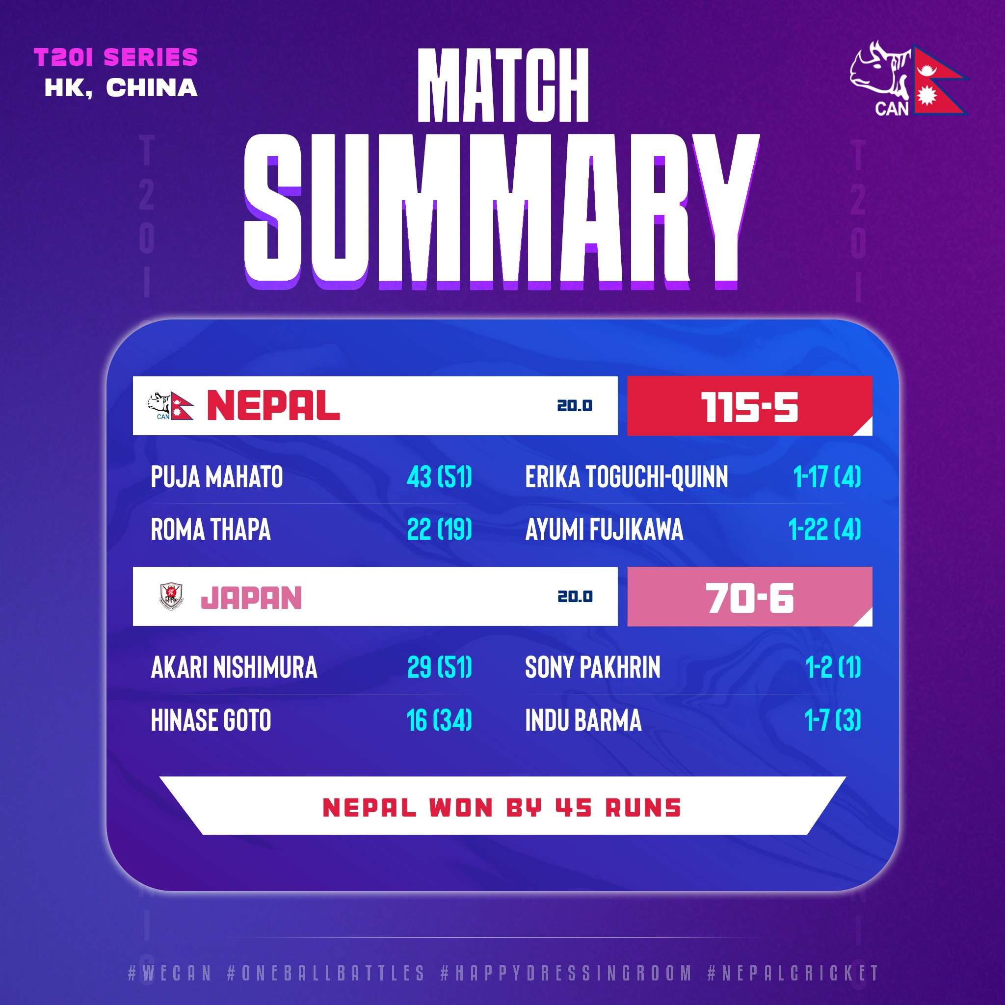 नेपालका लागि सीता राना मगरले ४३ र कप्तान इन्दु बर्माले १५ रन बनाउनु बाहेक अरुले दोहोरो अंकको रन नै जोड्न सकेनन् । ओपनर विन्दु रावल खाता नै नखोली पभेलिन फर्केपछि तेस्रो नम्बरमा ब्याटिङ गर्न गएकी सम्झना खड्काले पनि खाता खोल्न सकिनन् । अर्की ओपनर पूजा महतो टिमको स्कोर ११ रन हुँदा व्यक्तिगत ३ रनमा आउट भइन् ।चौथो नम्बरमा व्याटिङमा गएकी काजल श्रेष्ठ र पाँचौ नम्बरकी कप्तान बर्माले नेपाली इनिङ सम्हाल्ने कोसिस गरे पनि काजल ९ रनमा आउट भइन् भने रुबिना क्षेत्री एक बल पनि फेस नगर्दैै रन आउट भइन् ।