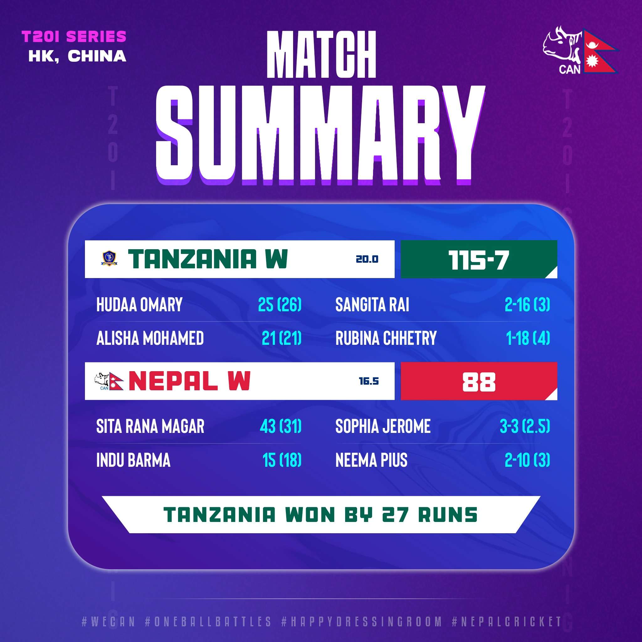 हङकङमा जारी प्रतियोगितामा नेपालले टस जितेर पहिला ब्याटिङ गर्दै पाँच विकेटको क्षतिमा एक सय १५ रन बनाएको थियो । नेपालका लागि पूजा महतोले ४३, रोमा थापाले २२, रुविना क्षेत्रीले २१ तथा कप्तान इन्दू बर्माले १२ रन बनाए । बलिङतर्फ जापानकी अहिल्या चण्डेल, एरिका टोगुची क्युइनले एक एक विकेट लिए । एक सय १६ रनको विजयी लक्ष्य पछ्याएको जापानले निर्धारित २० ओभरमा ६ विकेट गुमाएर ७० रन बनायो । जापानका लागि अकरी निशीमुराले २९, हिनासे गोटोले १६ र अहिल्या चण्डेलले ११ रन बनाइन् ।